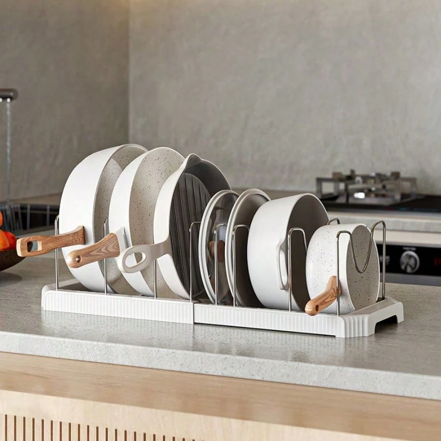 1 Retractable Pot Holder, 7 Adjustable Compartments, Flexible Kitchen Cookware Rack